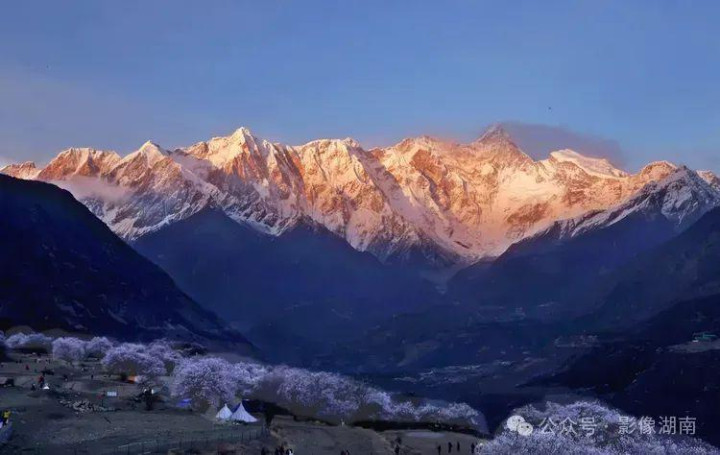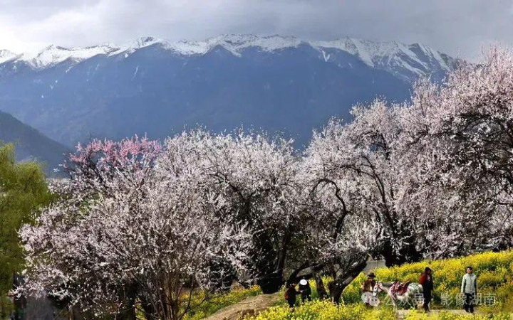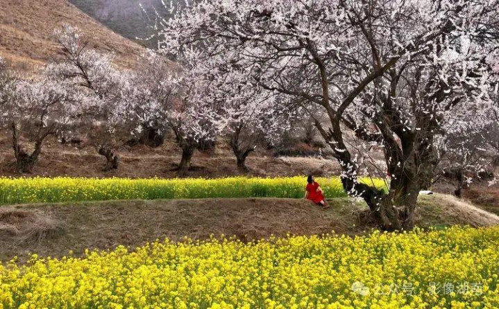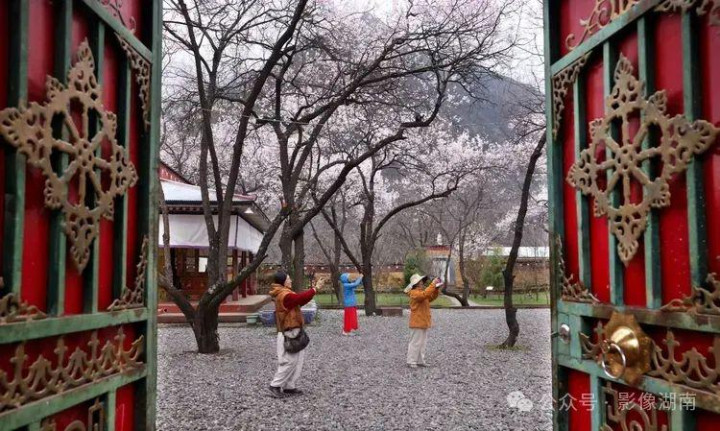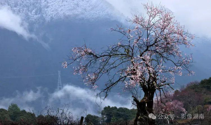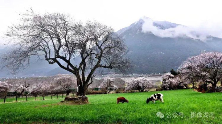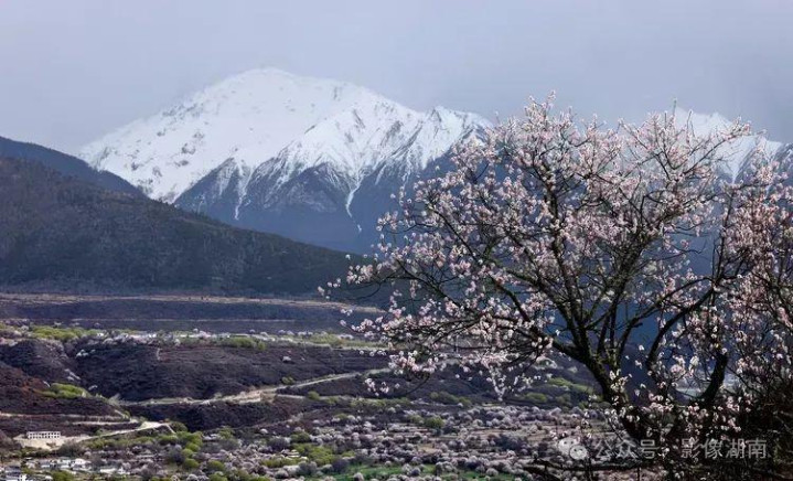 玛尼堆上的经文还沾着白霜,山脚下却已开满粉色的桃花。老桃树弯弯曲曲的枝干像画笔,在青稞田上空描绘着图画,风一吹,成千上万的花瓣像雪片般飘过。